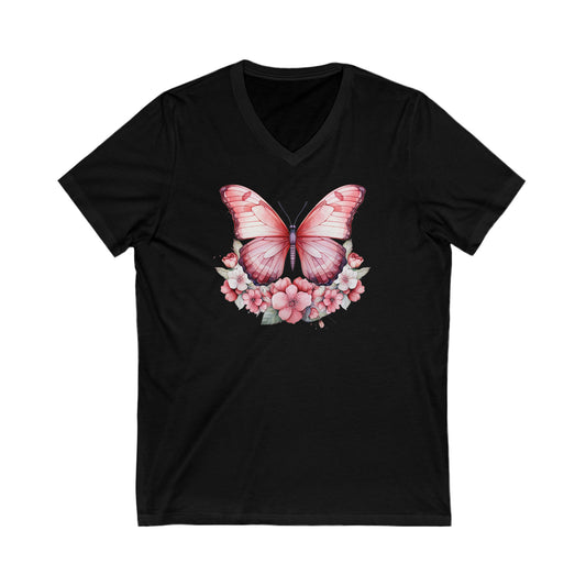 Beautiful Pink Butterfly Unisex Jersey Short Sleeve V-Neck Tee