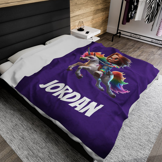 Chucky riding a Unicorn Velveteen Plush Blanket