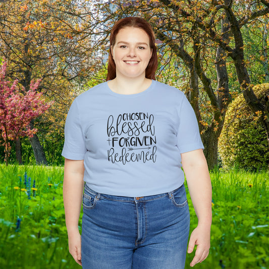 Chosen Blessed Forgiven Redeemed Unisex Jersey Short Sleeve Tee